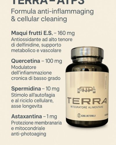 €55,00โข ATPยณ TERRA รจ la permanenza alla vita โข Contrasta i danni dei radicali liberi ; โข Spegne il rumore infiammatorio (maqui + quercetina) โข Favorisce il riciclo cellulare (spermidina) โข Protegge struttura e membrana (astaxantina). โข Promuove la longevitร della cellula.
