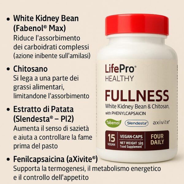 Ingredienti:fagiolo bianco (Phaseolus vulgaris L.) e.s. semi; chitosano (deriva da crostacei); Slendesta®[patata (Solanum tuberosum L.) tubero e.s. tit. 5% inibitori proteinasi; agente di rivestimento: idrossipropilmetilcellulosa, agente di carica: cellulosa; aXivite® (fenilcapsaicina microincapsulata); agente antiagglomerante: sali di magnesio degli acidi grassi.