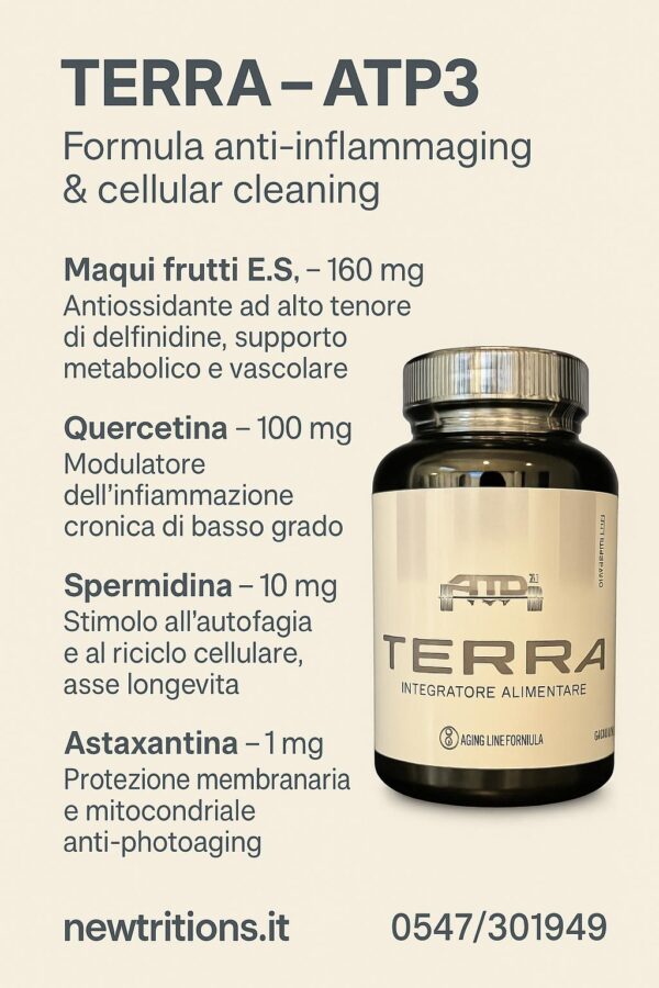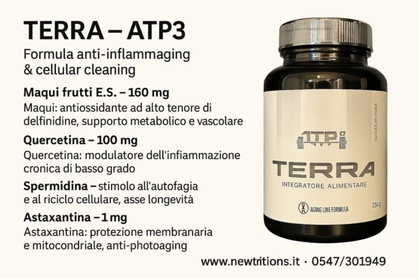 Ingredienti: Maqui )Aristotelelia Chilensis (Molina) Stuntz.) frutti e.s.; Quesrcetina da Sophora japonica L; Agente di carica cellulosa; Agenti antiagglomeranti: acidi grassi; sali di magnesio degli acidi grassi, biossido di silicio; Astaxantina da Haematococus pluvialis tallo; Sperimidina